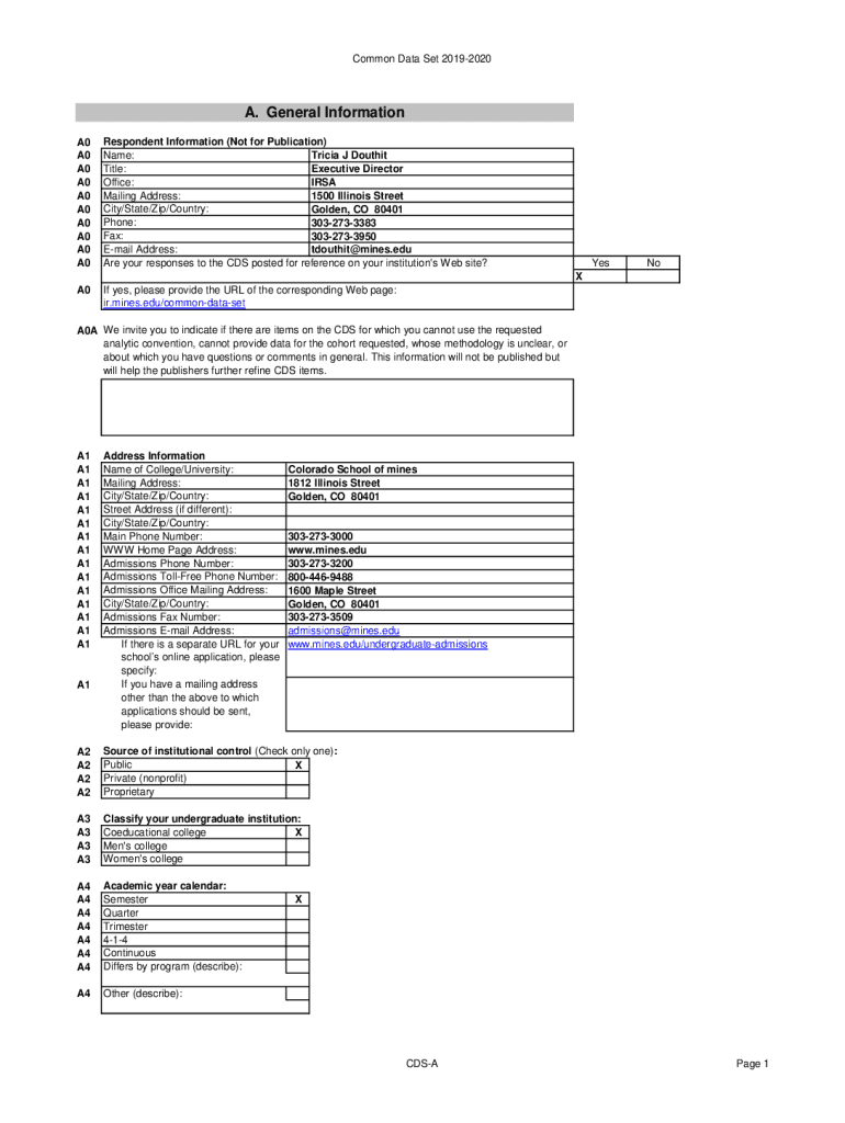 Common Data Set 20192020A. General Information A0 A0 A0 A0 A0 A0 A0 A0 A0 A0Respondent Information (Not for Publication) Name: Tricia JD outhit Title: Executive Director Office: IRA Mailing Address:
