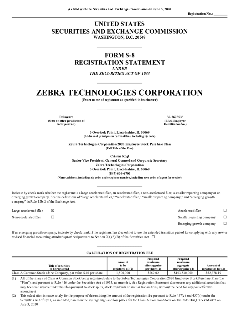 As filed with the Securities and Exchange Commission on June 5, 2020, Registration No.:UNITED STATES SECURITIES AND EXCHANGE COMMISSION WASHINGTON, D.C. 20549FORM S8 REGISTRATION STATEMENT UNDER THE