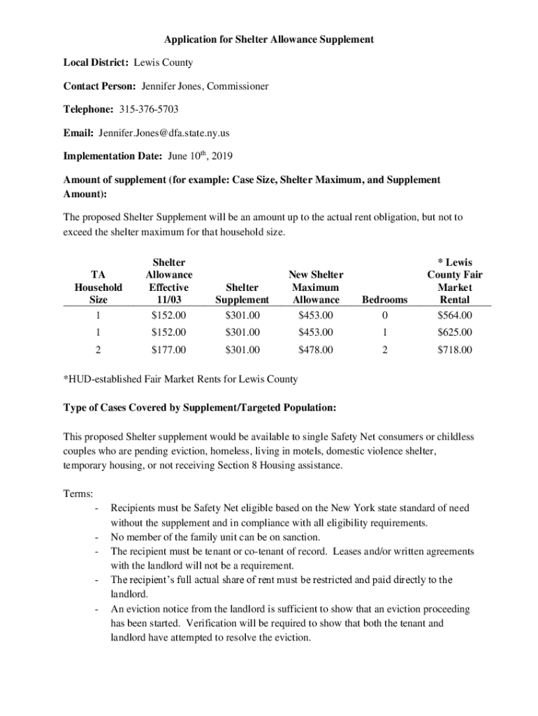 Application for Shelter Allowance Supplement Local District: Lewis County Contact Person: Jennifer Jones, Commissioner Telephone: 3153765703 Email: Jennifer.Jones@dfa.state.ny.us Implementation Date:
