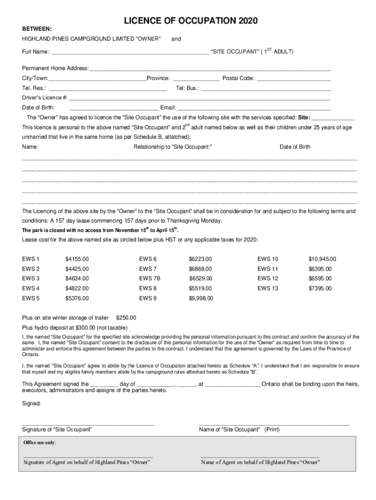 License OF OCCUPATION 2020 BETWEEN: HIGHLAND PINES CAMPGROUND LIMITED OWNERandFull Name: ___ SITE OCCUPANT (1STADULT)Permanent Home Address: ___ City/Town:___Province: ___ Postal Code: ___ Tel. Res.: