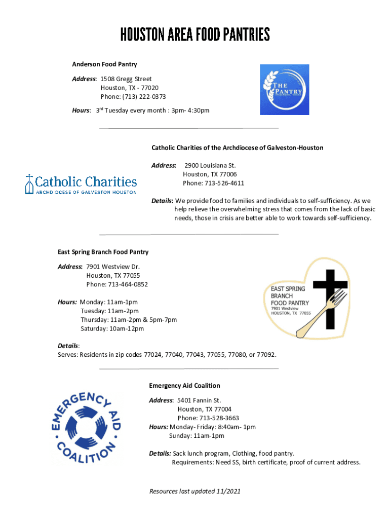 Anderson Food PantryAddress: 1508 Gregg Street Houston, TX 77020 Phone: (713) 2220373 Hours: 3rd Tuesday every month : 3pm 4:30pmCatholic Charities of the Archdiocese of Galveston Houston Address:2900