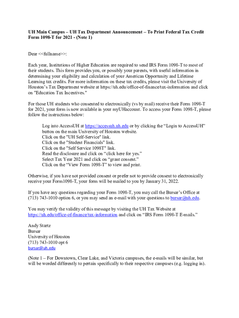 UH Main Campus UH Tax Department Announcement To Print Federal Tax Credit Form 1098T for 2021 (Note 1) Dear full name: Each year, Institutions of Higher Education are required to send IRS Form 1098T