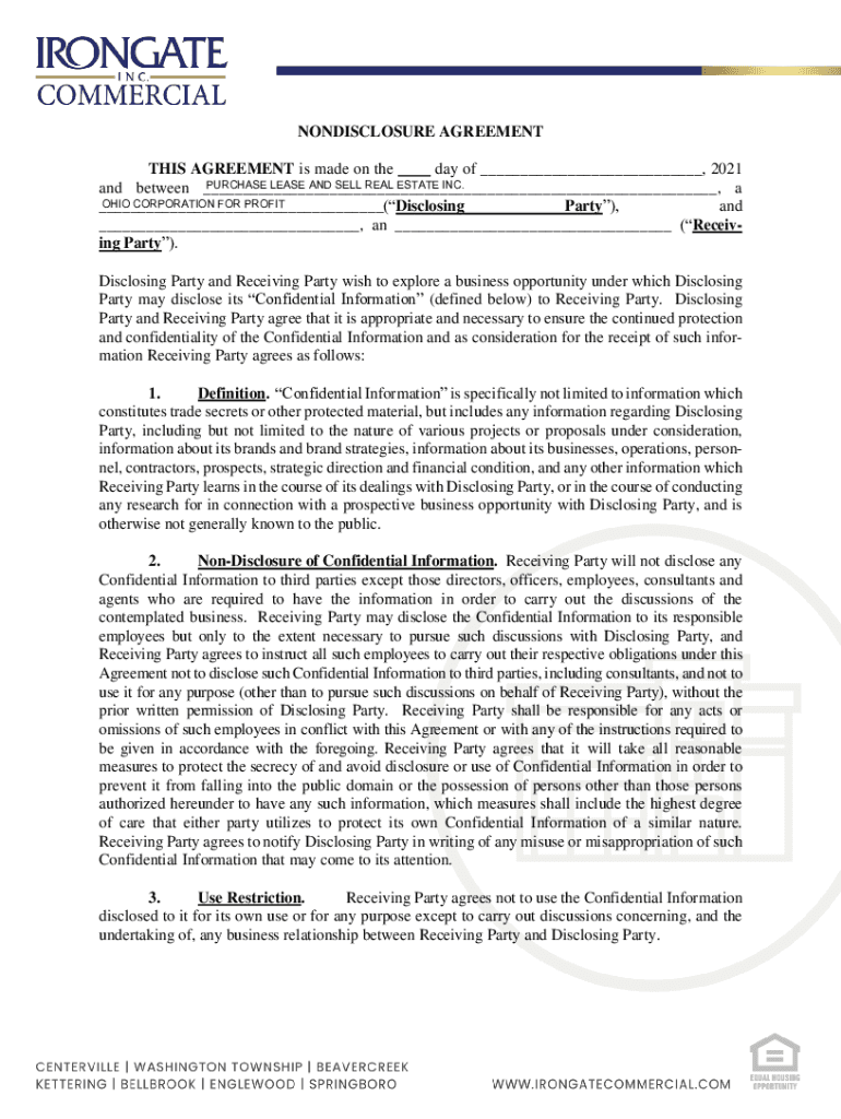 NONDISCLOSURE AGREEMENT THIS AGREEMENT is made on the day of ___, 2021 PURCHASE LEASE AND SELL REAL ESTATE INC. and between ___, a OHIO CORPORATION FOR PROFIT ___(Disclosing Party), and ___, an ___