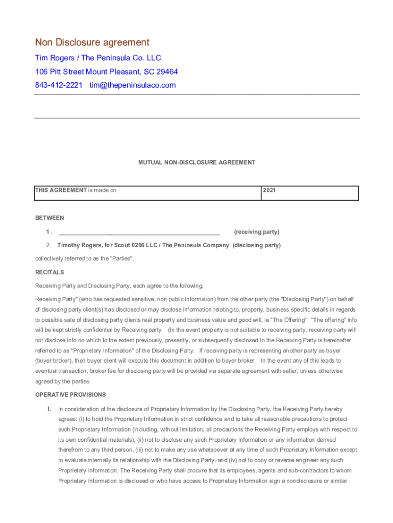 Non Disclosure agreement Tim Rogers / The Peninsula Co. LLC 106 Pitt Street Mount Pleasant, SC 29464 8434122221 tim@thepeninsulaco.comMUTUAL NONDISCLOSURE AGREEMENTS AGREEMENT is made on2021BETWEEN