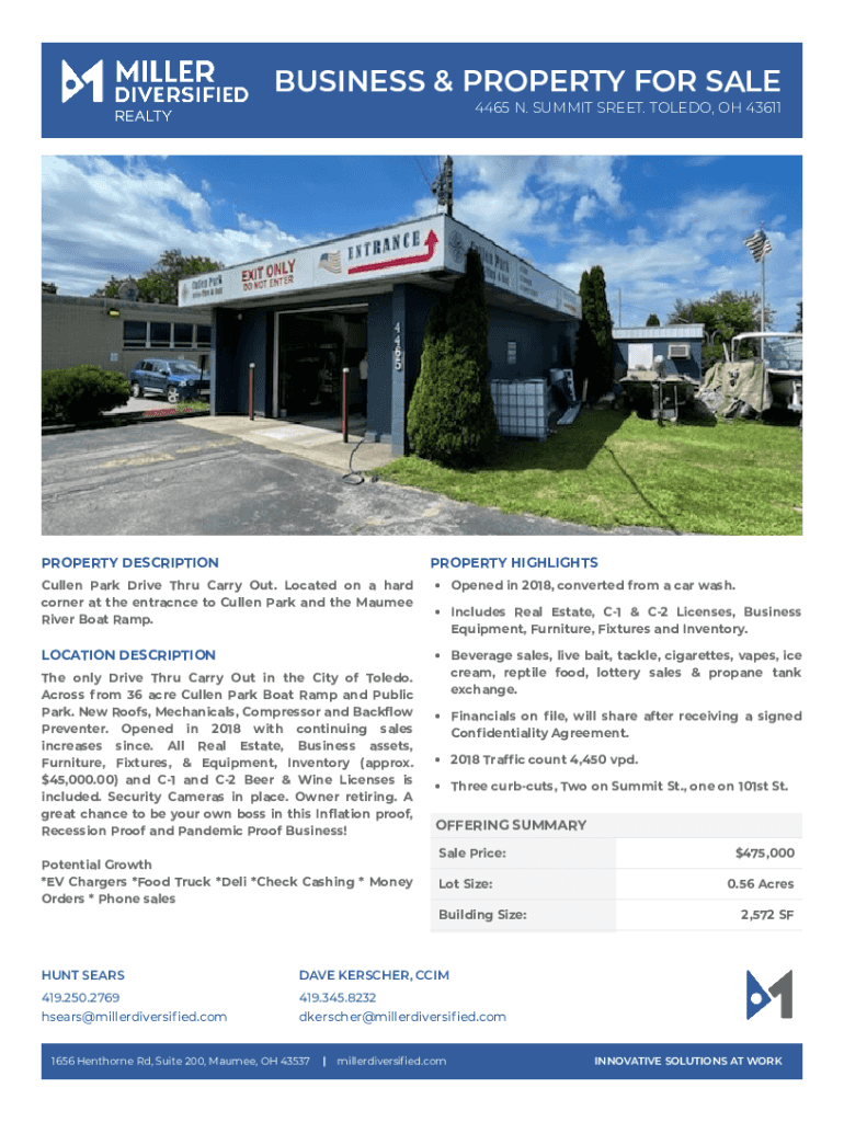 BUSINESS & PROPERTY FOR SALE 4465 N. SUMMIT STREET. TOLEDO, OH 43611PROPERTY DESCRIPTIONPROPERTY HIGHLIGHTS Cullen Park Drive Through Carry Out. Located on a hard corner at the entrance to Cullen