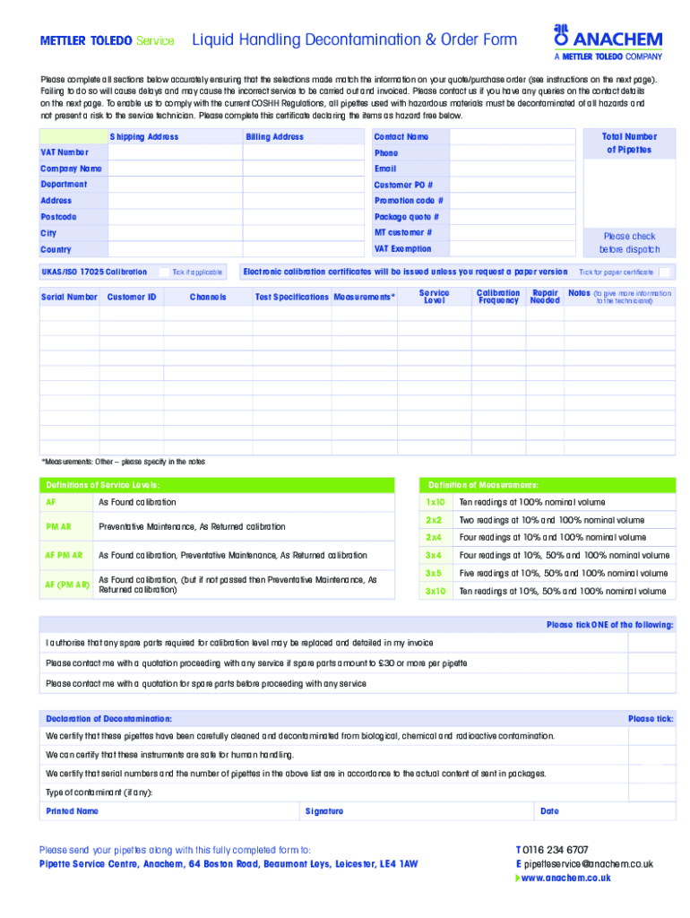 Get the free Liquid Handling Decontamination & Order Form - mt.com