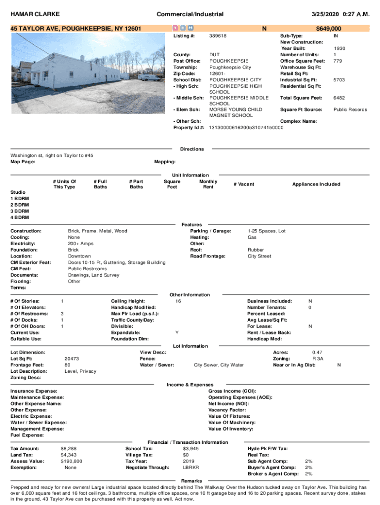LAMAR CLARKE3/25/20200:27A. M.Commercial/Industrial 45 TAYLOR AVE, POUGHKEEPSIE, NY 12601 N Listing #: County: Post Office: Township: Zip Code: School Dist: High Sch:$389618649,000 SubType: New Construction: