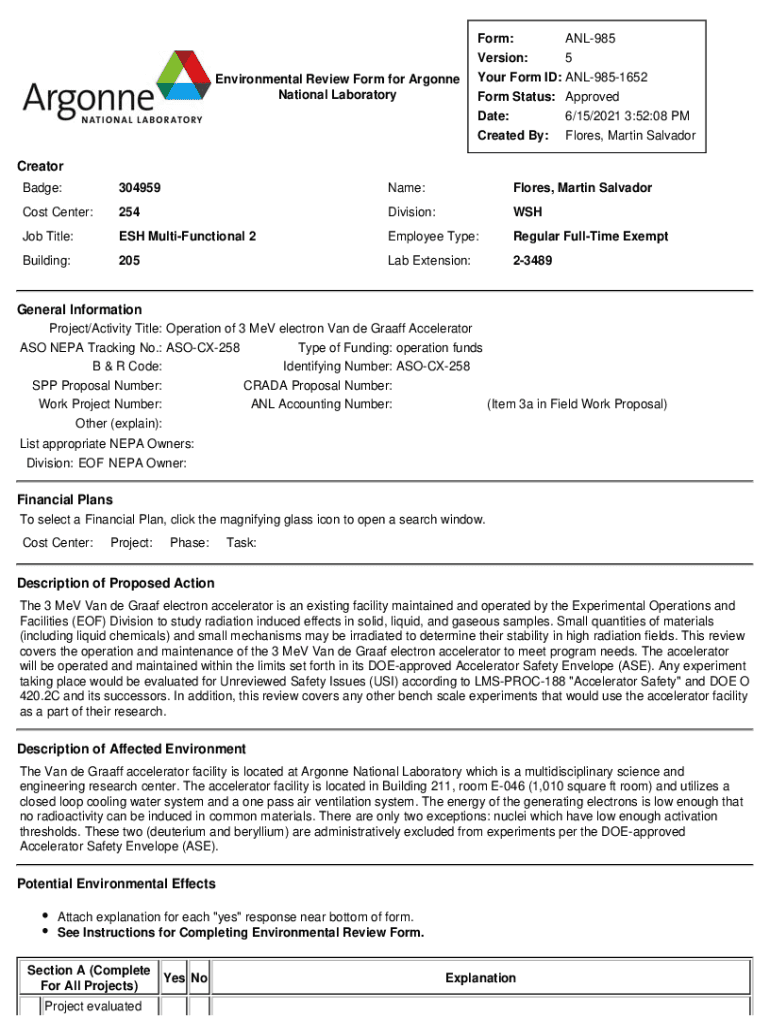 Environmental Review Form for Argonne National LaboratoryForm: Version: Your Form ID: Form Status: Date: Created By:ANL985 5 ANL9851652 Approved 6/15/2021 3:52:08 PM Flores, Martin Salvador Creator