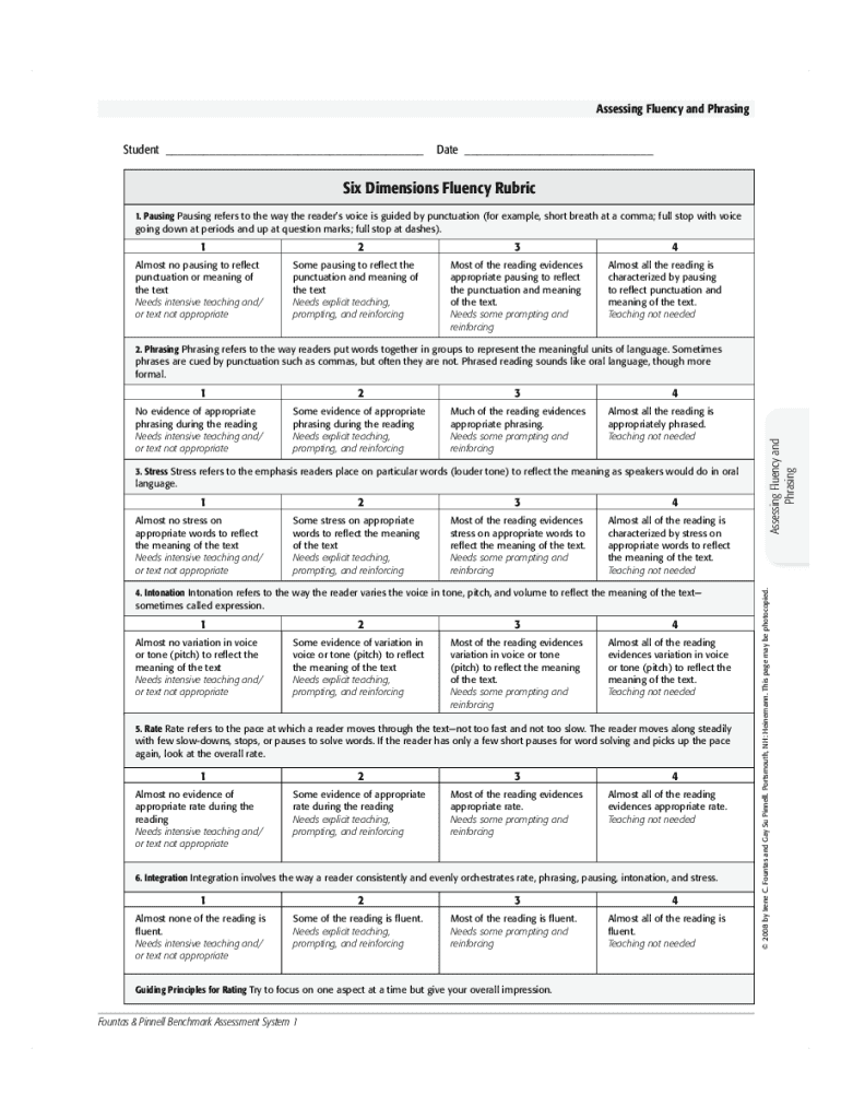 Assessing Fluency and Phrasing Student ___Date ___Six Dimensions Fluency Rubric 1. Pausing refers to the way the readers voice is guided by punctuation (for example, short breath at a comma; full