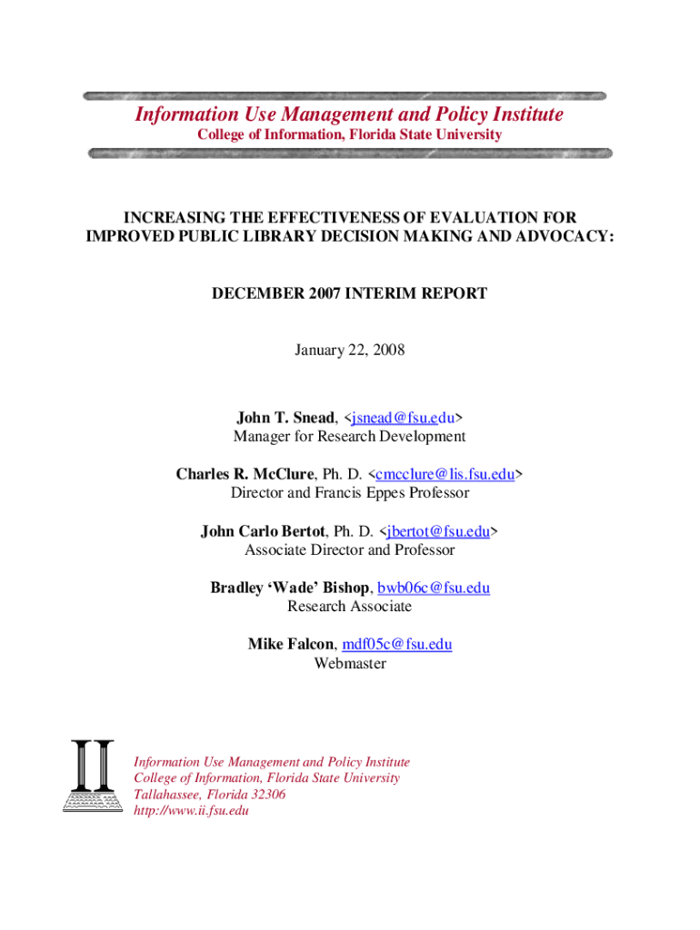 Information Use Management and Policy Institute College of Information, Florida State UniversityINCREASING THE EFFECTIVENESS OF EVALUATION FOR IMPROVED PUBLIC LIBRARY DECISION MAKING AND ADVOCACY:DECEMBER