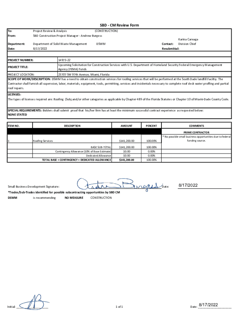 SBD CM Review Form To: From:Project Review & Analysis (CONSTRUCTION) SBD Construction Project Manager Andrew BurgessDepartment: Date:Department of Solid Waste Management 8/17/2022PROJECT NUMBER:Karina