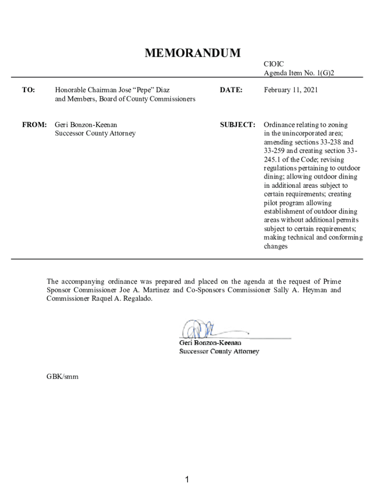 MEMORANDUM &,2,& Agenda Item No. * TO:Honorable&KDLUPDQRVH3HSH\'LD] and Members, Board of County CommissionersDATE:)HEUXDUFROM:Germ BonzonKeenan Successor County AttorneySUBJECT:Ordinance relating