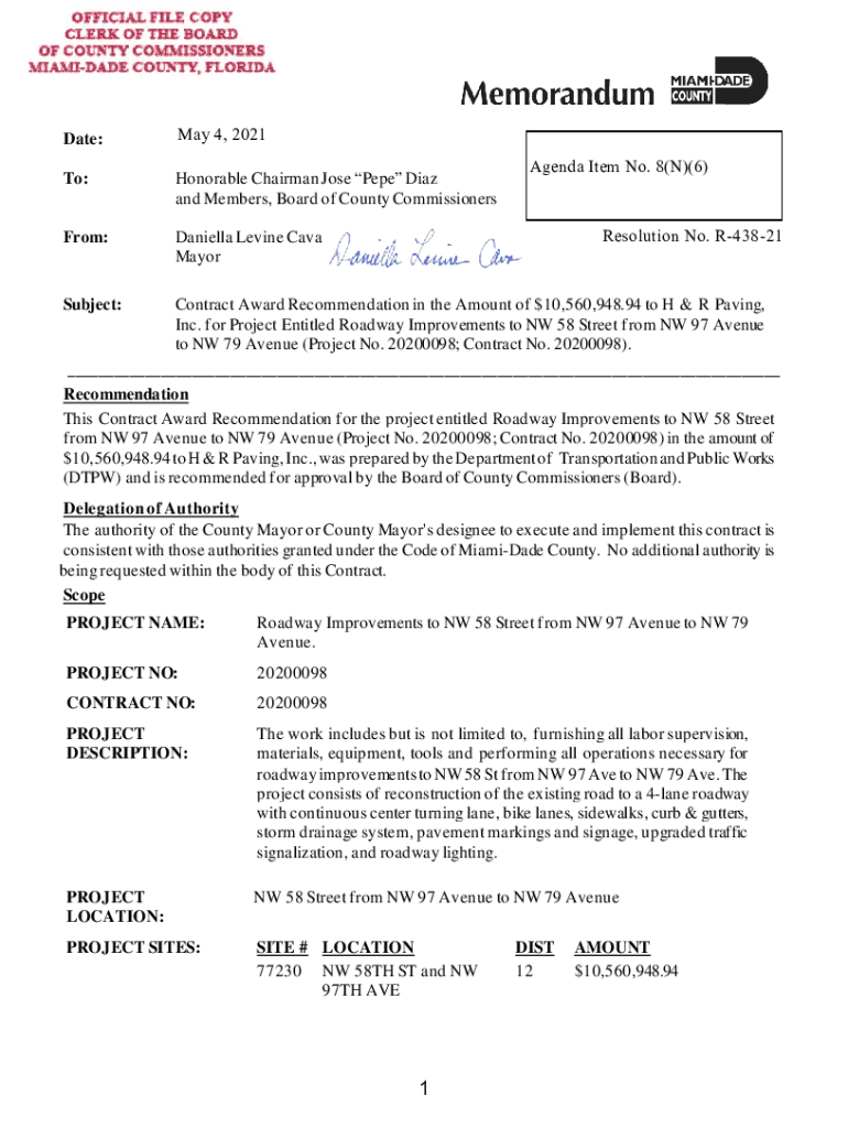 Date:May 4, 2021, Agenda Item No. 8(N)(6)To:Honorable Chairman Jose Pepe Diaz and Members, Board of County CommissionersFrom:Daniella Levine Cave MayorSubject:Contract Award Recommendation in the