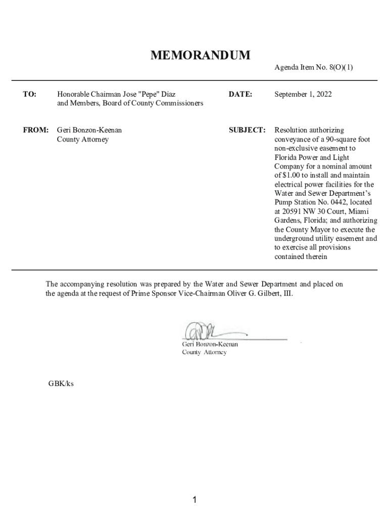 MEMORANDUMAgenda Item No. 8(O)(1)TO:Honorable Chairman Jose \” Pepe\” Diaz and Members, Board of County CommissionersDATE:September 1, 2022FROM:Germ BonzonKeenan County AttorneySUBJECT:Resolution