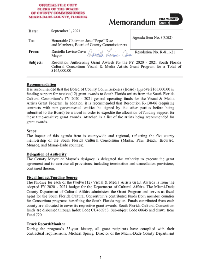 Date:September 1, 2021To:Honorable Chairman Jose Pepe Diaz and Members, Board of County CommissionersFrom:Daniella Levine Cave MayorSubject:Resolution Authorizing Grant Awards for the FY 2020 2021