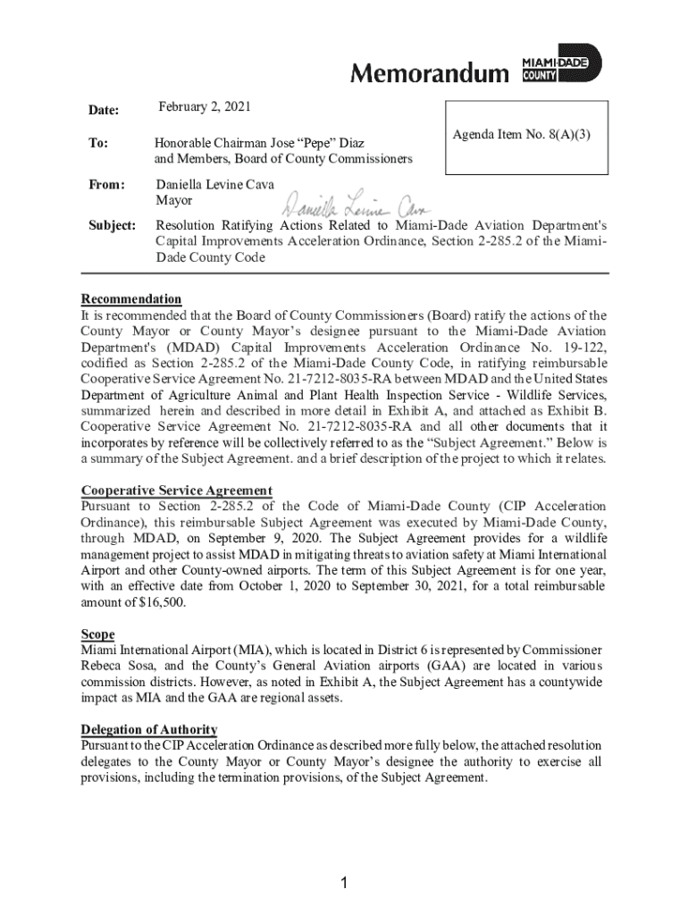 Date:February 2, 2021, Agenda Item No. 8(A)(3)To:Honorable Chairman Jose Pepe Diaz and Members, Board of County CommissionersFrom:Daniella Levine Cave MayorSubject:Resolution Ratifying Actions Related