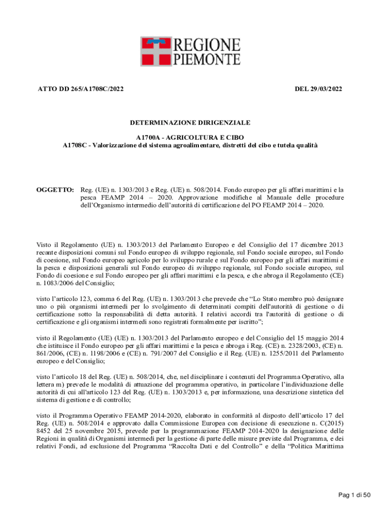 ATT ODD 265/A1708C/2022DEL 29/03/2022DETERMINAZIONE DIRIGENZIALE A1700A AGRICULTURAL E CIO A1708C Valorization Del system agroalimentare, ristretto Del CIO e tutelage qualitOGGETTO: Reg. (UE) n. 1303/2013
