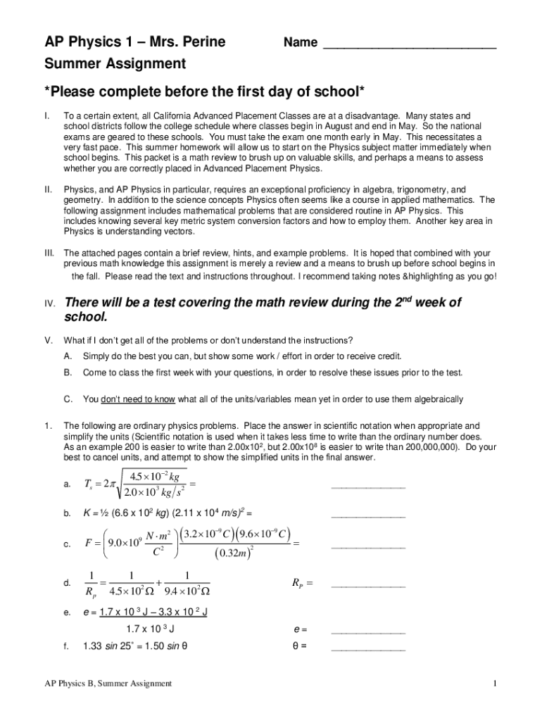 AP Physics 1 Mrs. Perineum ___Summer Assignment *Please complete before the first day of school* I. To a certain extent, all California Advanced Placement Classes are at a disadvantage. Many states
