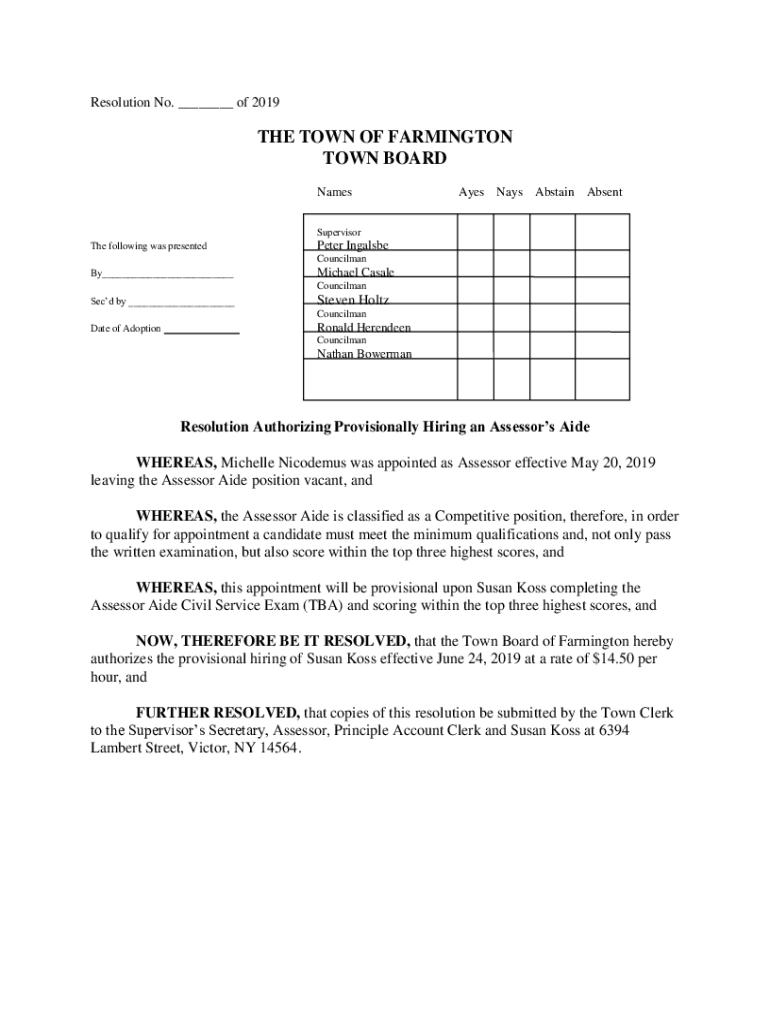 Resolution No. ___ of 2019THE TOWN OF FARMINGTON TOWN BOARD NamesAyesNaysAbstainAbsentSupervisor The following was presented Peter Inhale CouncilmanBy___Michael Castle CouncilmanSecd by ___Steven