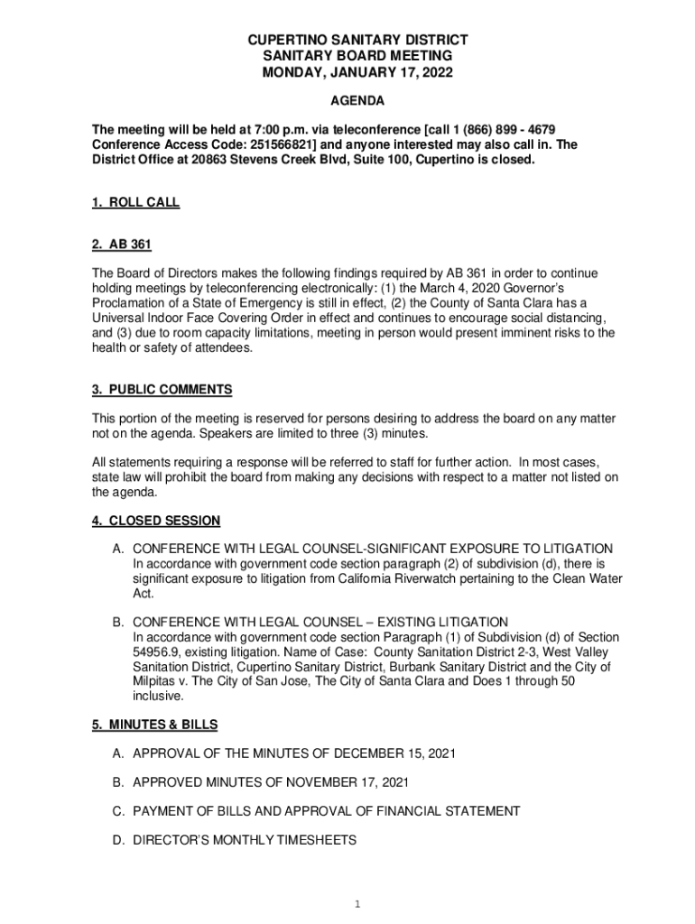 CUPERTINO SANITARY DISTRICT SANITARY BOARD MEETING MONDAY, JANUARY 17, 2022, AGENDA The meeting will be held at 7:00 p.m. via teleconference [call 1 (866) 899 4679 Conference Access Code: 251566821]