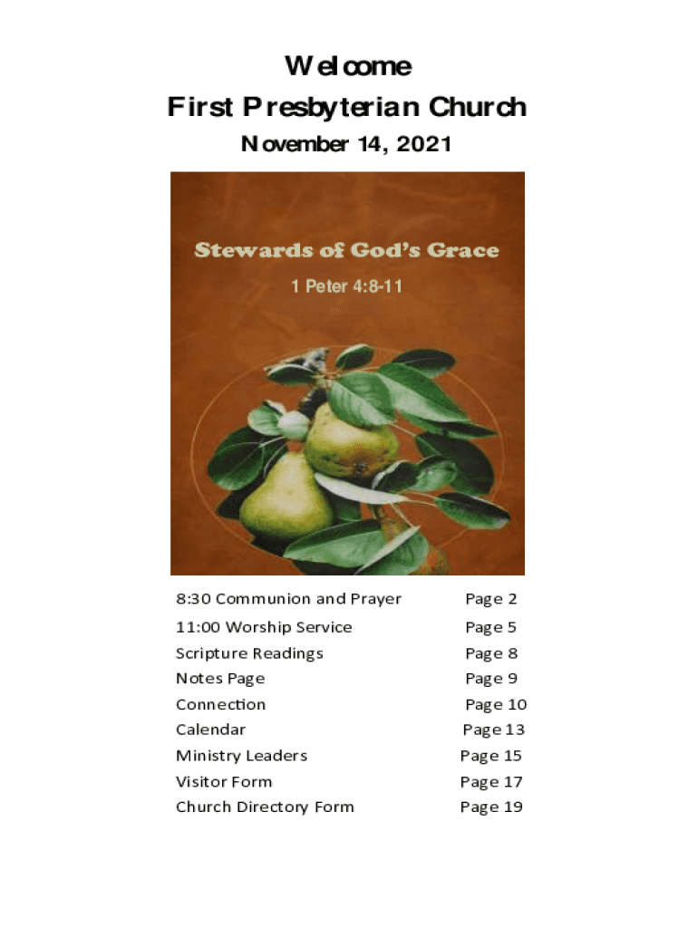 Welcome First Presbyterian Church November 14, 2021Stewards of Gods Grace 1 Peter 4:8118:30 Communion and Prayer Page 211:00 Worship Service Page 5Scripture Readings Page 8Notes Page 9ConnectionPage