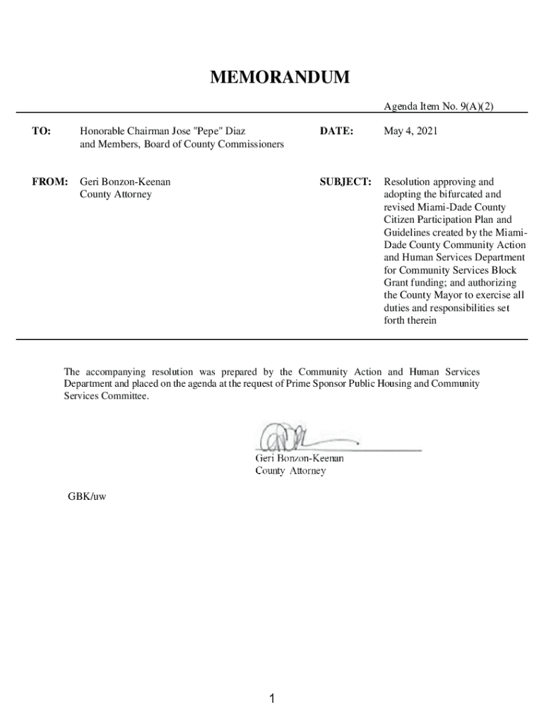 MEMORANDUM Agenda Item No. 9(A)(2) TO:Honorable Chairman Jose \” Pepe\” Diaz and Members, Board of County CommissionersDATE:May 4, 2021FROM:Germ BonzonKeenan County AttorneySUBJECT:Resolution