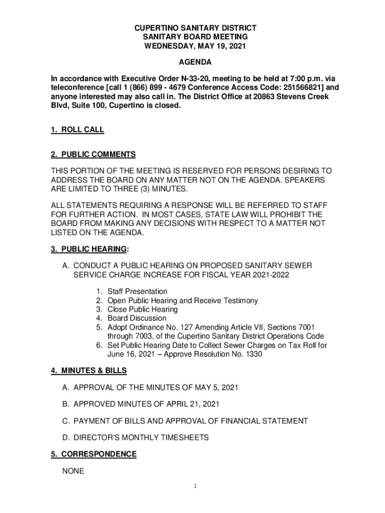 CUPERTINO SANITARY DISTRICT SANITARY BOARD MEETING WEDNESDAY, MAY 19, 2021, AGENDA In accordance with Executive Order N3320, meeting to be held at 7:00 p.m. via teleconference [call 1 (866) 899 4679