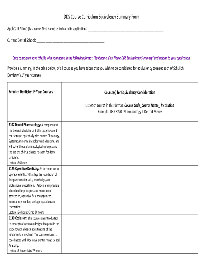 DDS Course Curriculum Equivalency Summary Form Applicant Name (Last name, First Name) as indicated in application: ___ Current Dental School: ___ Once completed save this file with your name in the