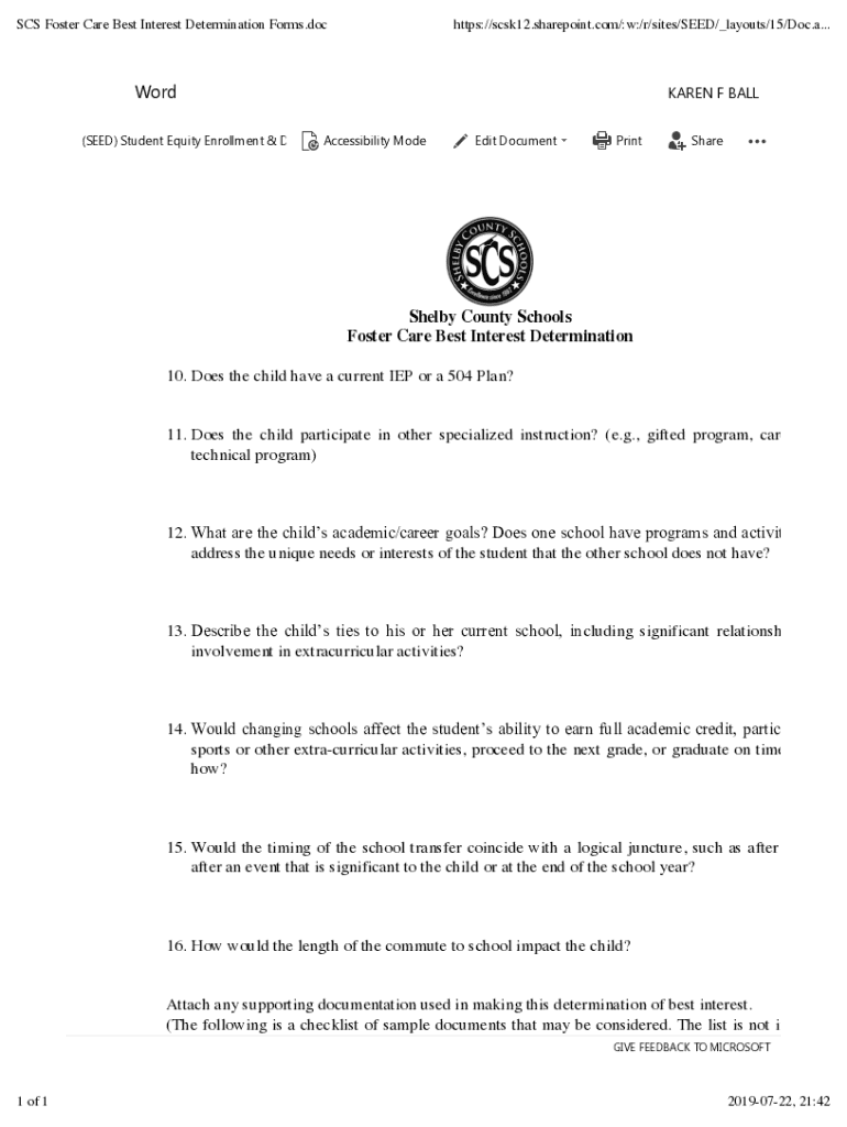SCS Foster Care Best Interest Determination Forms.doctors://scsk12.sharepoint.com/:w:/r/sites/SEED/_layouts/15/Doc.a... Workmen F BALL(SEED) Student Equity Enrollment & Discipline SCS Foster Accessibility