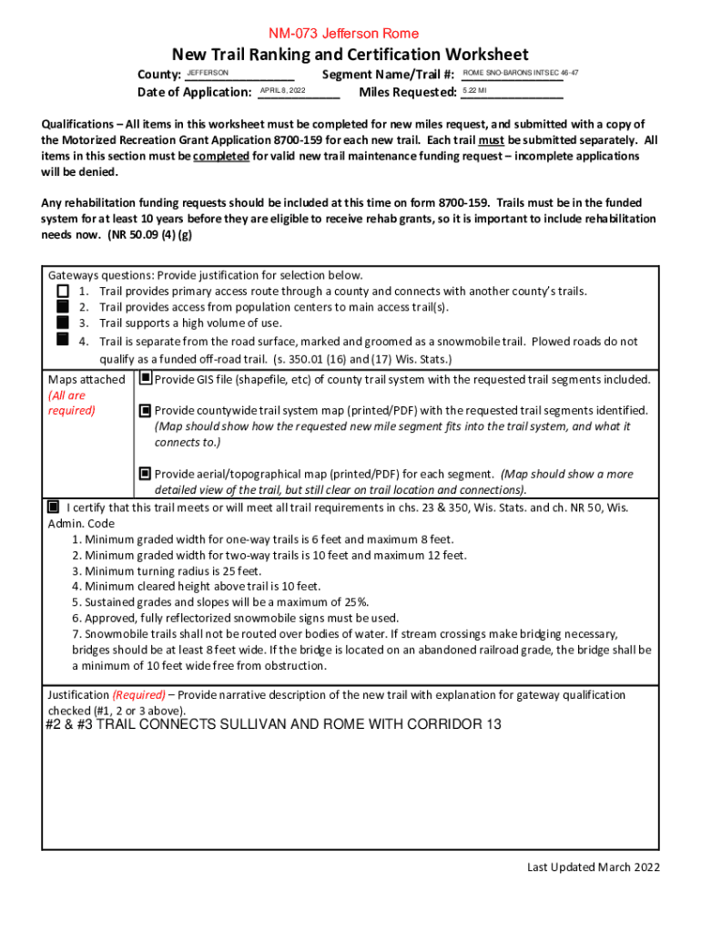 NM073 Jefferson Renew Trail Ranking and Certification WorksheetJEFFERSON ROME BARONS INT SEC 4647 County: ___ Segment Name/Trail #: ___ APRIL 8, 2022 5.22 MI Date of Application: ___ Miles Requested: