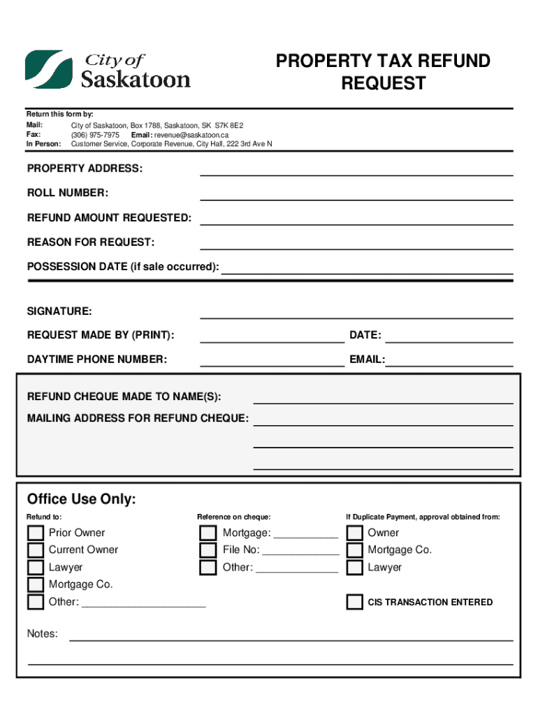 The Property Tax Refund Request is a government form used by property owners in Saskatoon, Saskatchewan, to request a refund of overpaid property taxes.
