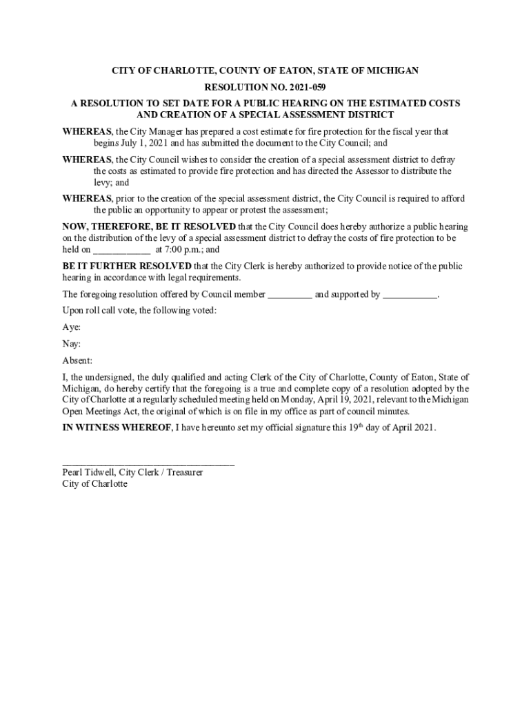 CITY OF CHARLOTTE, COUNTY OF EATON, STATE OF MICHIGAN RESOLUTION NO. 2021059 A RESOLUTION TO SET DATE FOR A PUBLIC HEARING ON THE ESTIMATED COSTS AND CREATION OF A SPECIAL ASSESSMENT DISTRICT WHEREAS,