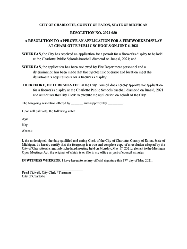 CITY OF CHARLOTTE, COUNTY OF EATON, STATE OF MICHIGANRESOLUTION NO. 2021080 A RESOLUTION TO APPROVE AN APPLICATION FOR A FIREWORKS DISPLAY AT CHARLOTTE PUBLIC SCHOOLS ON JUNE 6, 2021, WHEREAS, the
