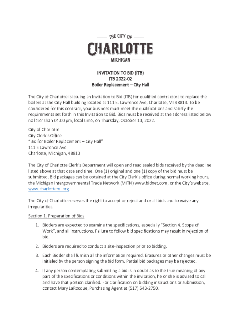INVITATION TO BID (ITB) ITB 202202 Boiler Replacement City Hall The City of Charlotte is issuing an Invitation to Bid (ITB) for qualified contractors to replace the boilers at the City Hall building