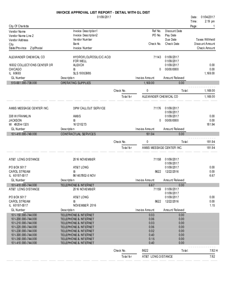 INVOICE APPROVAL LIST REPORT DETAIL WITH GL DIST 01/09/2017Date: Time: Page:City Of Charlotte Vendor Name Line 2 Vendor Address City State/Province Zip/Postal ALEXANDER CHEMICAL CO 16932 COLLECTIONS