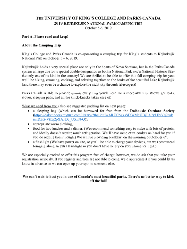THE UNIVERSITY OF King's College AND PARKS CANADA 2019 KEJIMKUJIK NATIONAL PARK CAMPING TRIP October 56, 2019 Part A. Please read and keep! About the Camping Trip King's College and Parks Canada is