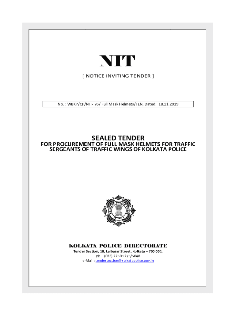 Notice Inviting Tender Page|1NIT [NOTICE INVITING TENDER]No. BKP/CP/NITWIT/CP/NIT 76/ Full Mask Helmets/TEN, Dated: 18.11.20 2019SEALED TENDERER PROCUREMENT OF FULL MASK HELMETS FOR TRAFFIC ERA SERGEANTS