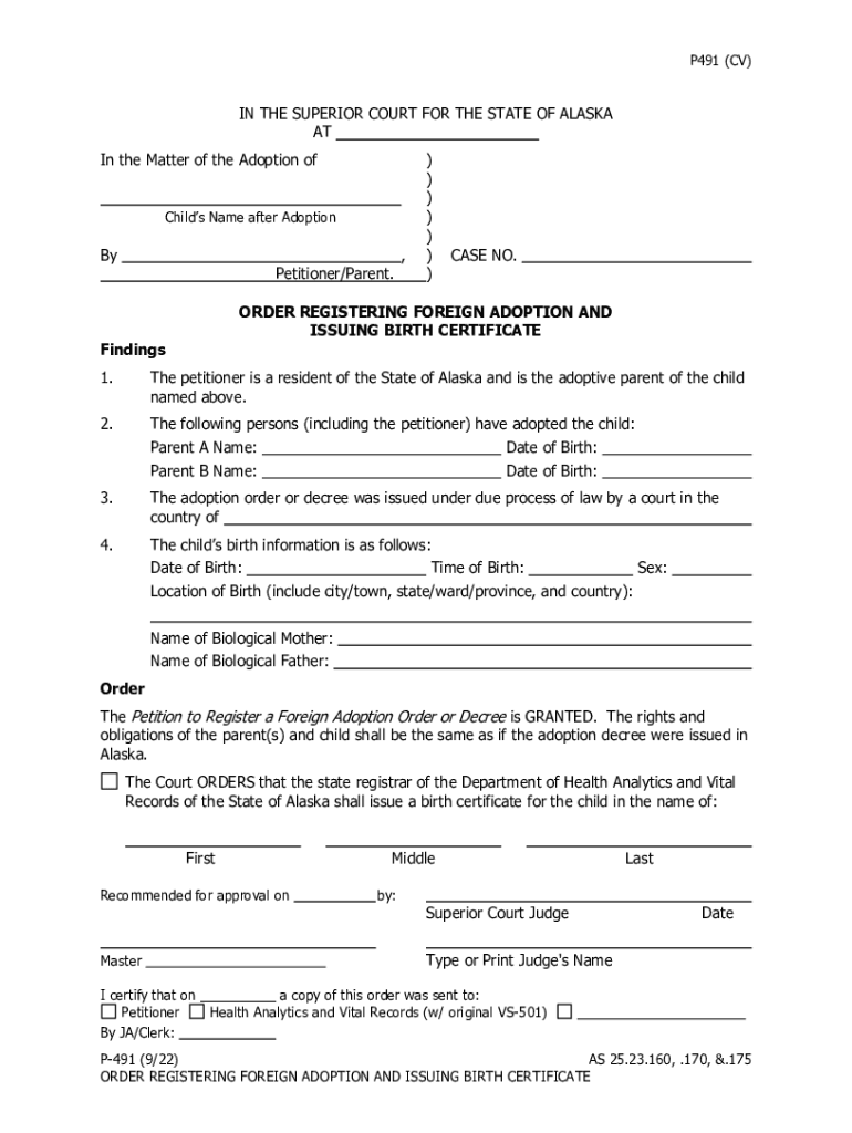 P491 (CV)IN THE SUPERIOR COURT FOR THE STATE OF ALASKA AT In the Matter of the Adoption of Child's Name after AdoptionByPetitioner/Parent., ) ))))))CASE NO.ORDER REGISTERING FOREIGN ADOPTION AND ISSUING