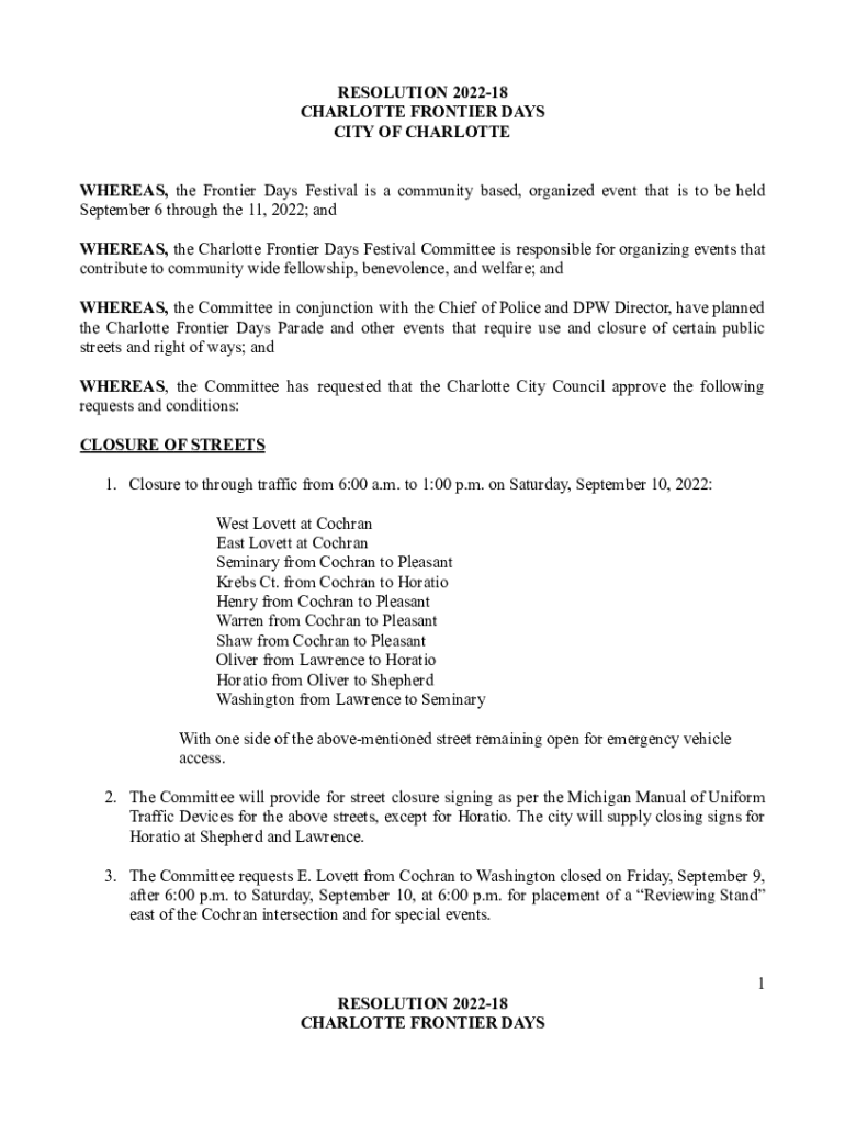 RESOLUTION 202218 CHARLOTTE FRONTIER DAYS CITY OF CHARLOTTE WHEREAS, the Frontier Days Festival is a community based, organized event that is to be held September 6 through the 11, 2022; and WHEREAS,