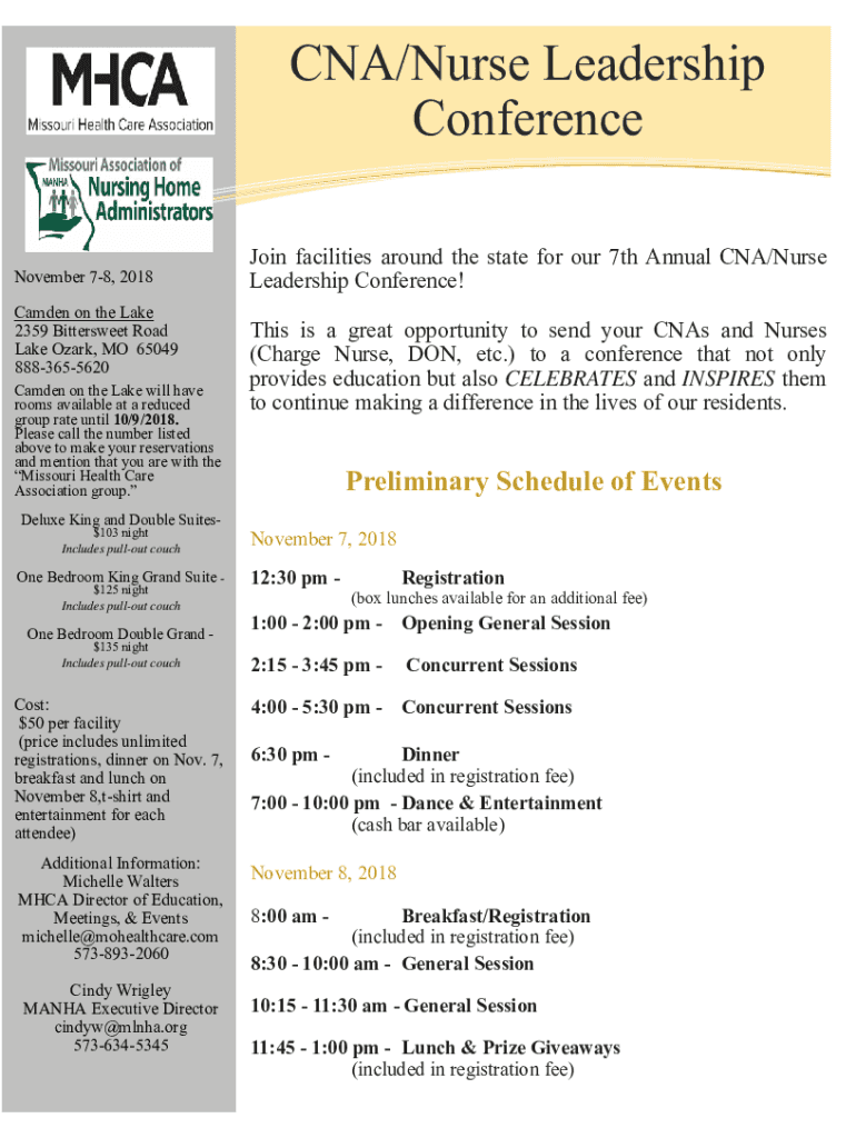 CNA/Nurse Leadership Conference November 78, 2018 Camden on the Lake 2359 Bittersweet Road Lake Ozark, MO 65049 8883655620 Camden on the Lake will have rooms available at a reduced group rate until