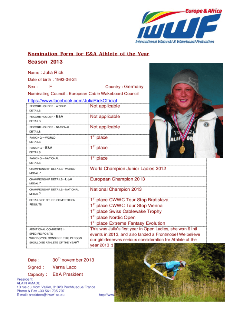 Nomination Form for E&A Athlete of the Year Season 2013 Name : Julia Rick Date of birth : 19930624 Sex :Country : GermanyNominating Council : European Cable Wake board Councilhttps://www.facebook.com/JuliaRickOfficial