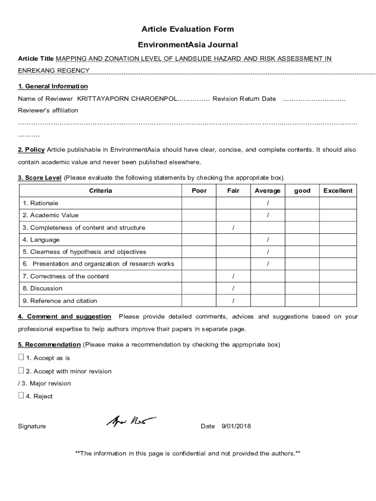 Article Evaluation Form Environment Asia Journal Article Title MAPPING AND DONATION LEVEL OF LANDSLIDE HAZARD AND RISK ASSESSMENT IN ENTERING REGENCY 1. General Information Name of Reviewer KRITTAYAPORN