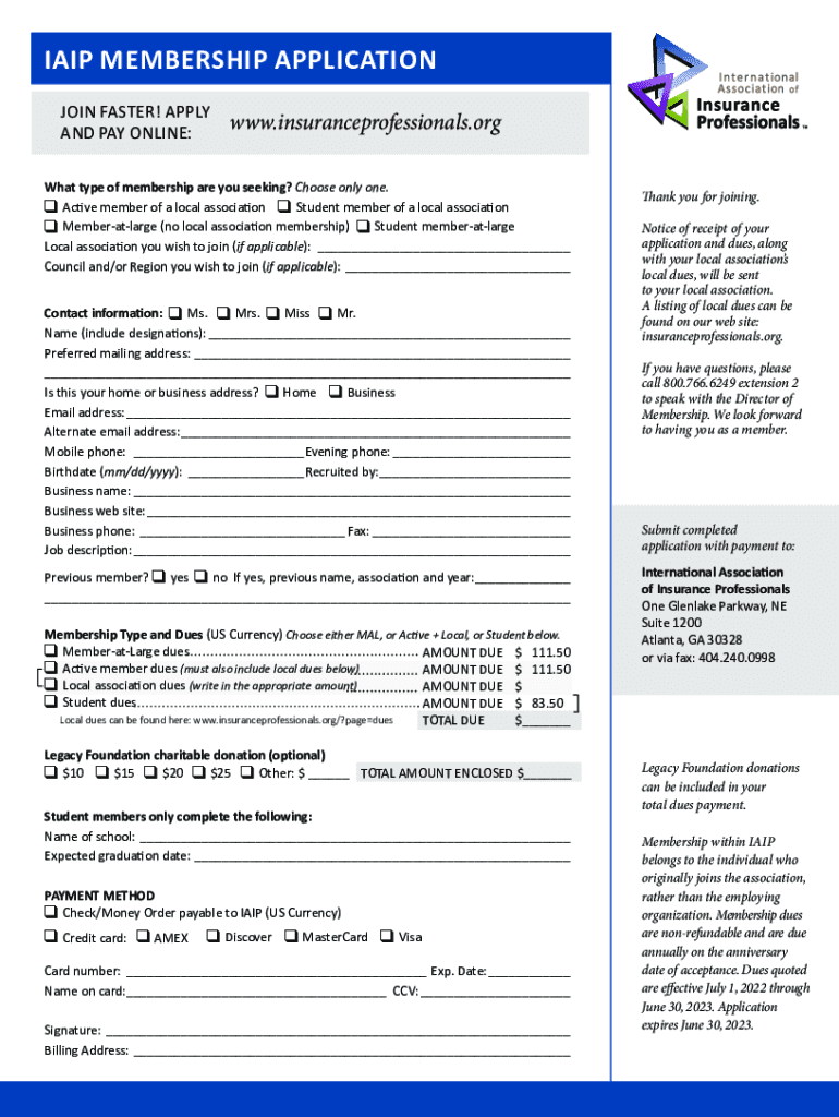 IAP MEMBERSHIP APPLICATION JOIN FASTER! APPLY AND PAY ONLINE:www.insuranceprofessionals.orgWhat type of membership are you seeking? Choose only one. Active member of a local association Student member