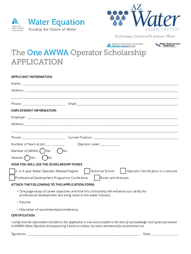 Get the free The One AWWA Operator Scholarship - AZ Water Association
