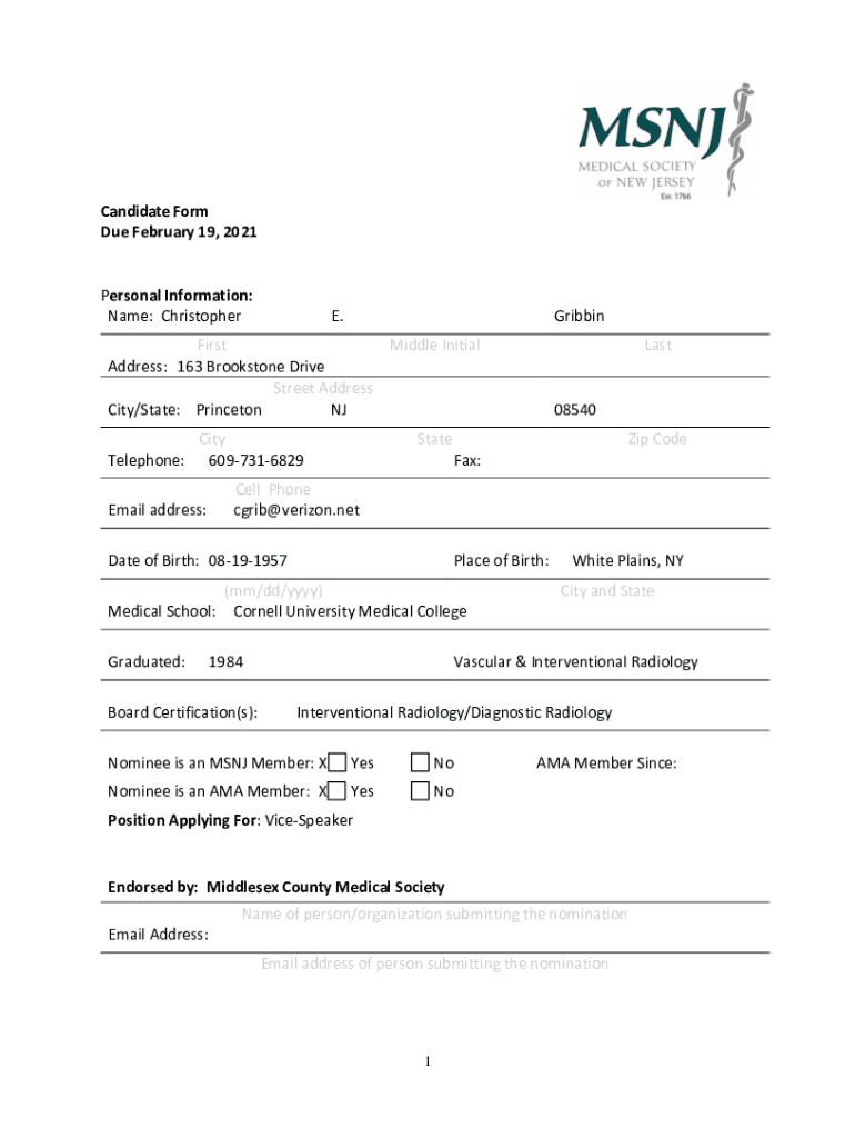 Candidate Form Due February 19, 2021Personal Information: Name: Christopher. GribbinFirst Middle Initial Address: 163 Brook stone Drive Street Address City/State: Princeton NJ Telephone:City 6097316829Email