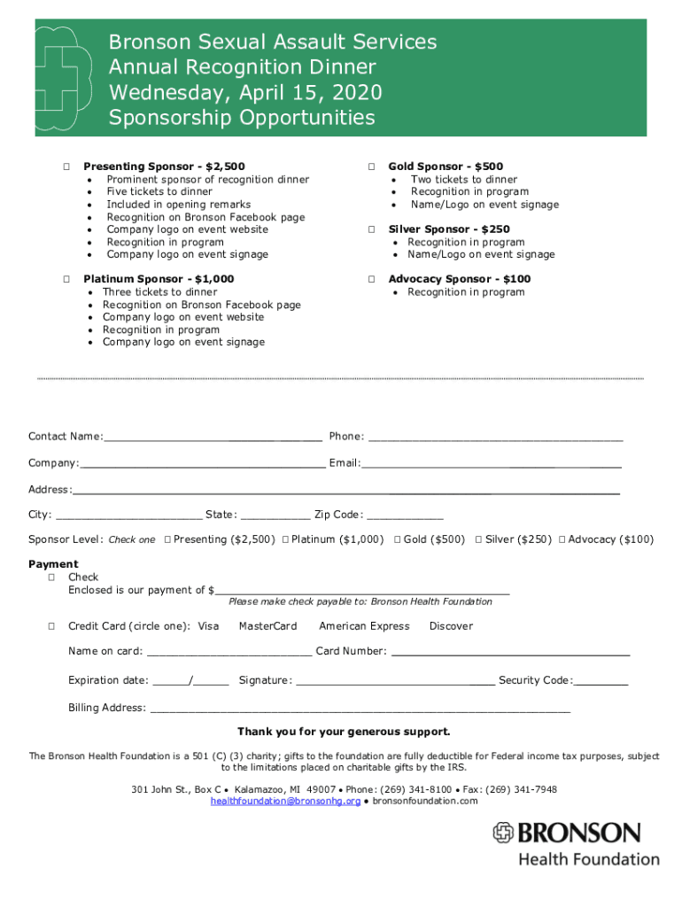 Bronson Sexual Assault Services Annual Recognition Dinner Wednesday, April 15, 2020, Sponsorship Opportunities Presenting Sponsor $2,500 Prominent sponsor of recognition dinner Five tickets to dinner