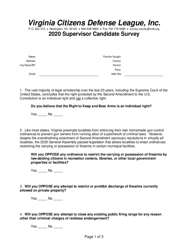 Virginia Citizens Defense League, Inc. P.O. Box 513 Newington, VA 22122 8046390600 Fax 7037199489 survey.county@vcdl.org2020 Supervisor Candidate Surname:Position Sought:Address:County:City/State/ZIP:District: