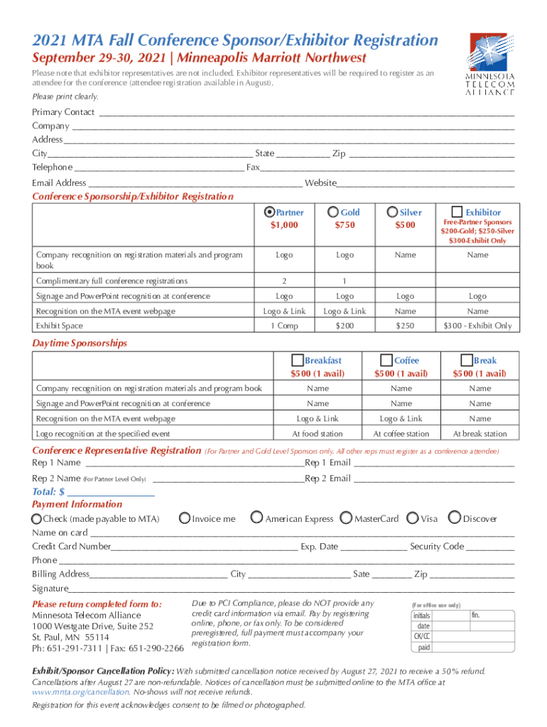 2021 MTA Fall Conference Sponsor/Exhibitor Registration September 2930, 2021 | Minneapolis Marriott NorthwestPlease note that exhibitor representatives are not included. Exhibitor representatives