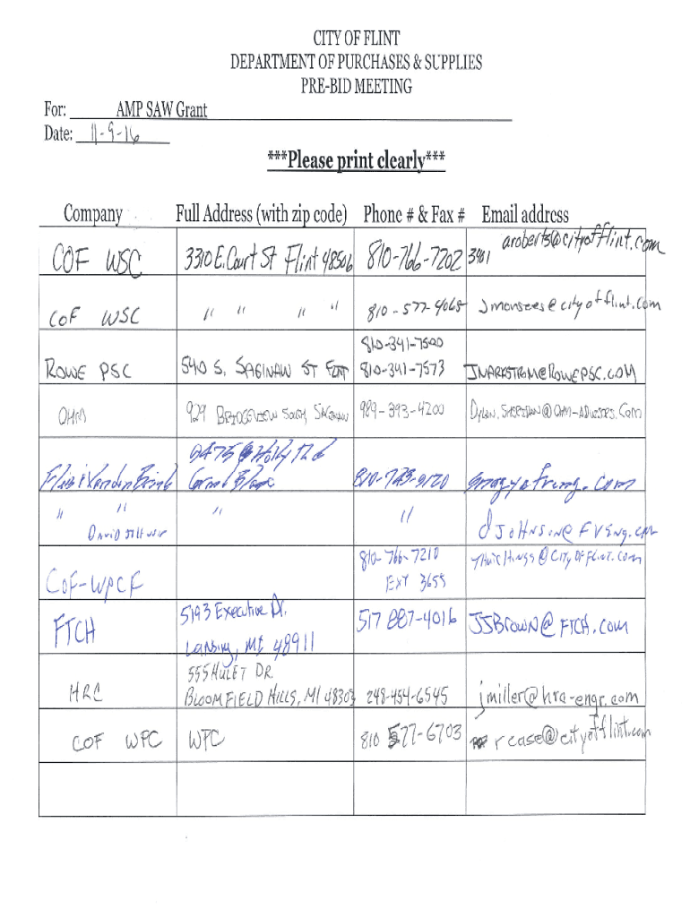CITY OF FLINT DEPARTMENT OF PURCHASES & SUPPLIES PREBID MEETING For:Update:SAW Grantl1c.***Please Print clearly*** Full Address (with zip code)CompanyCO1 TTC # & Fax #Email address33,OEC(1S The 9Js