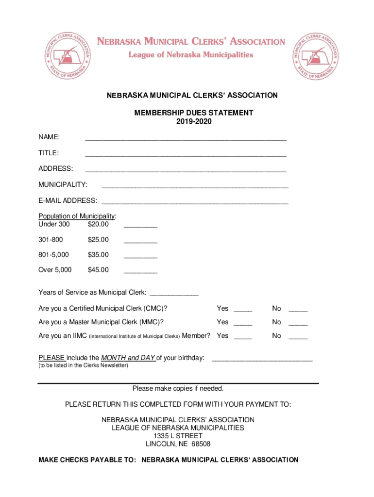 NEBRASKA MUNICIPAL CLERKS ASSOCIATION MEMBERSHIP DUES STATEMENT 20192020 NAME:___TITLE:___ADDRESS:___MUNICIPALITY:___EMAIL ADDRESS: ___ Population of Municipality: Under $30020.00___$30180025.00___$8015,00035.00___Over
